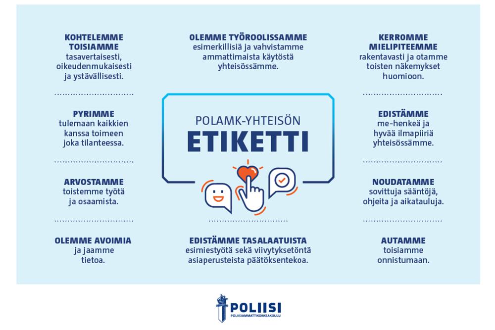 Vuorovaikutustamme ja yhteistyötämme ohjaa yhdessä henkilöstömme ja opiskelijoidemme kanssa valmisteltu Polamk-yhteisön etiketti. Hyödynsimme yhteisöllisen työskentelymme pohjana
