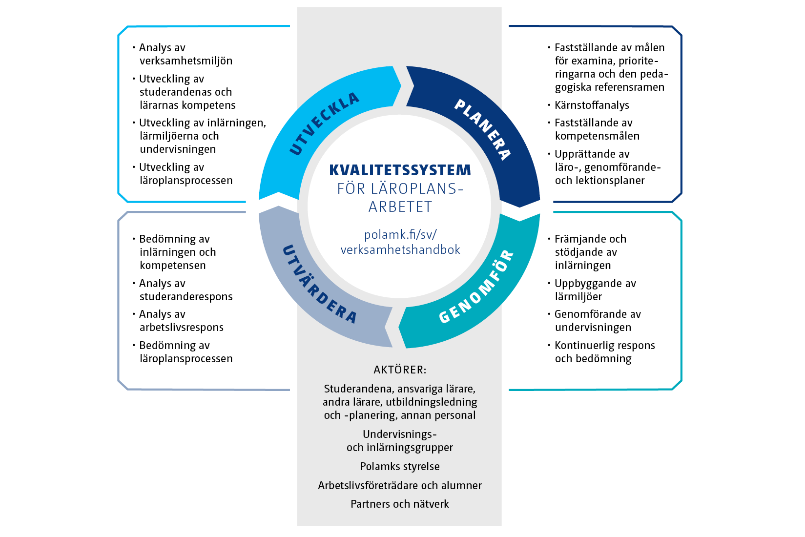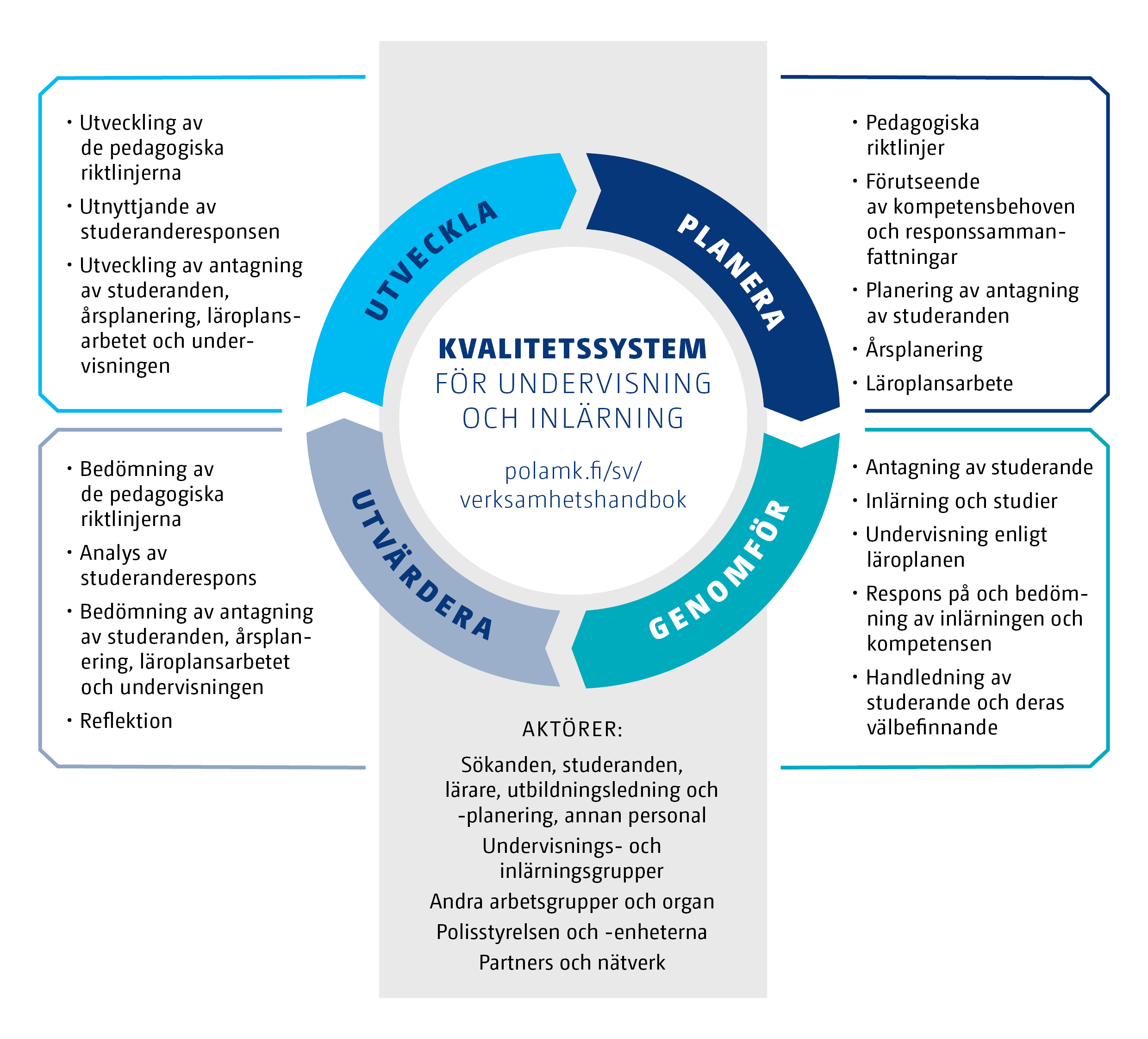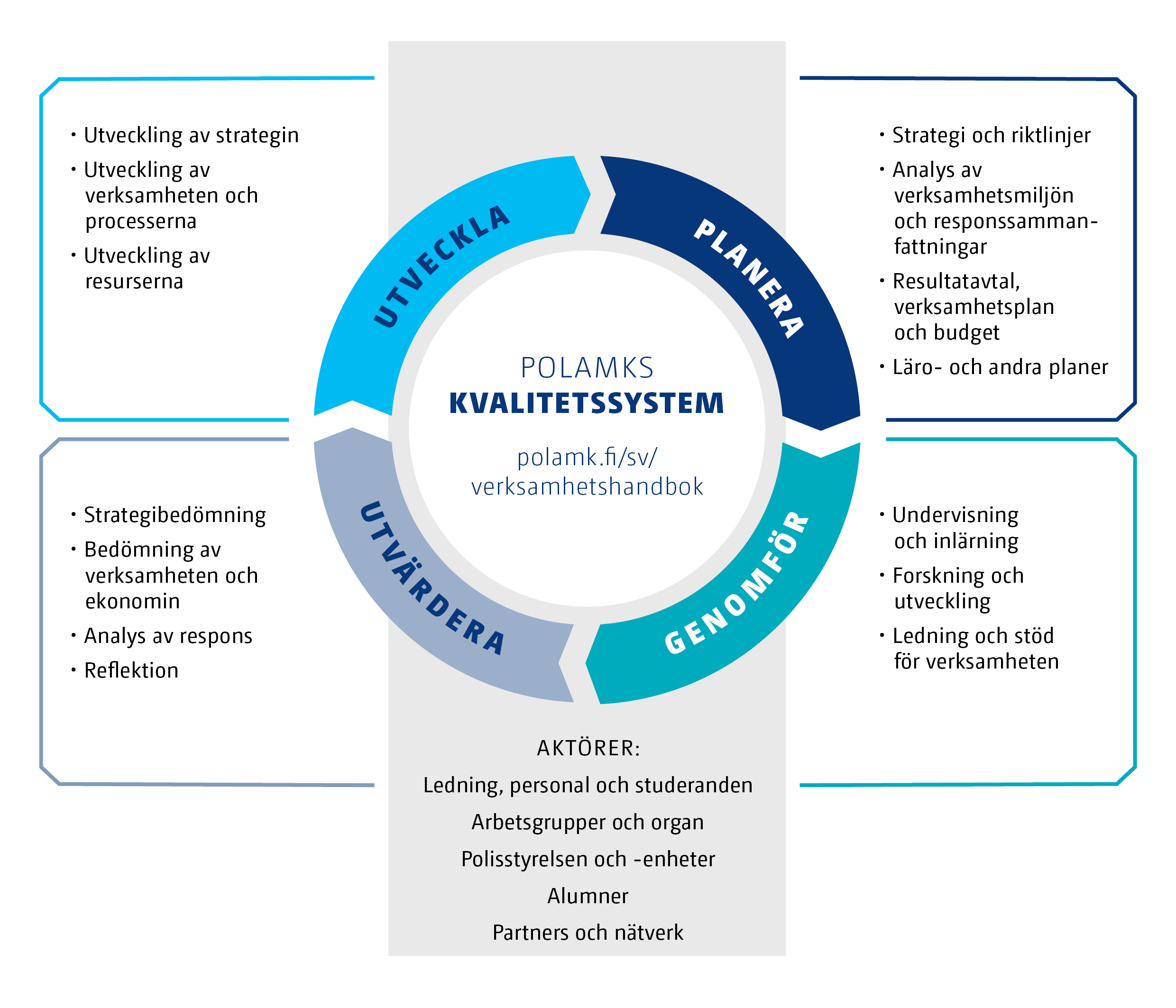 PDCA-modellen för fortgående förbättring (planera, genomför, utvärdera, utveckla) strukturerar våra förfaranden och aktörer för kvalitetsledning samt säkerställer kontinuerlig kunskapsbaserad utveckling.